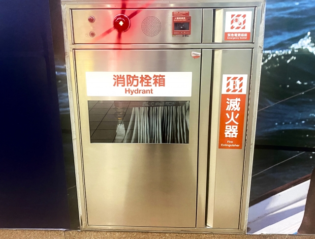 これも日本と似ていますね。消防ホースと消火器が収納されているボックスになります。消防栓箱の標示の上には非常ボタンがありますね。