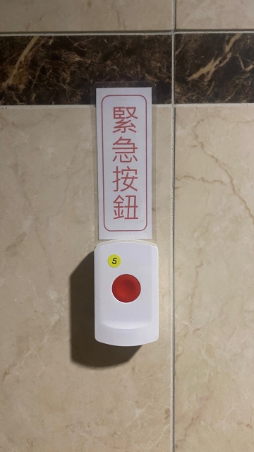 これは公衆トイレなどにある緊急ボタンです。緊急按鈕(ㄐㄧㄣˇ ㄐㄧˊ ㄢˋ ㄋㄧㄡˇ)といって緊急時に動けなくなった、気分が悪くなった、倒れてしまったなどの時にボタンを押すと、緊急対応をしてくれるというものです。