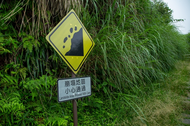 崩塌地區 小心通過は崩壊エリア!気を付けて通って!という意味になります。絵を見ても見るからに危ない感じがしますので、できるだけそのような道は通らないようにしたいですね。特に台風や大雨が降った後、地震が起こった後はさらに崩れやすくなります。