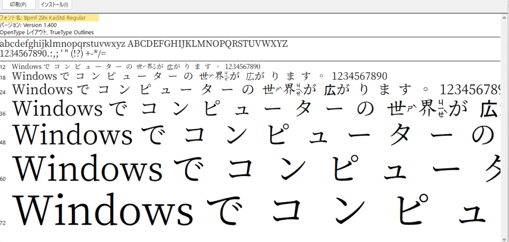 フォントファイルをダブルクリックすると、下のようなウィンドウが開きます。