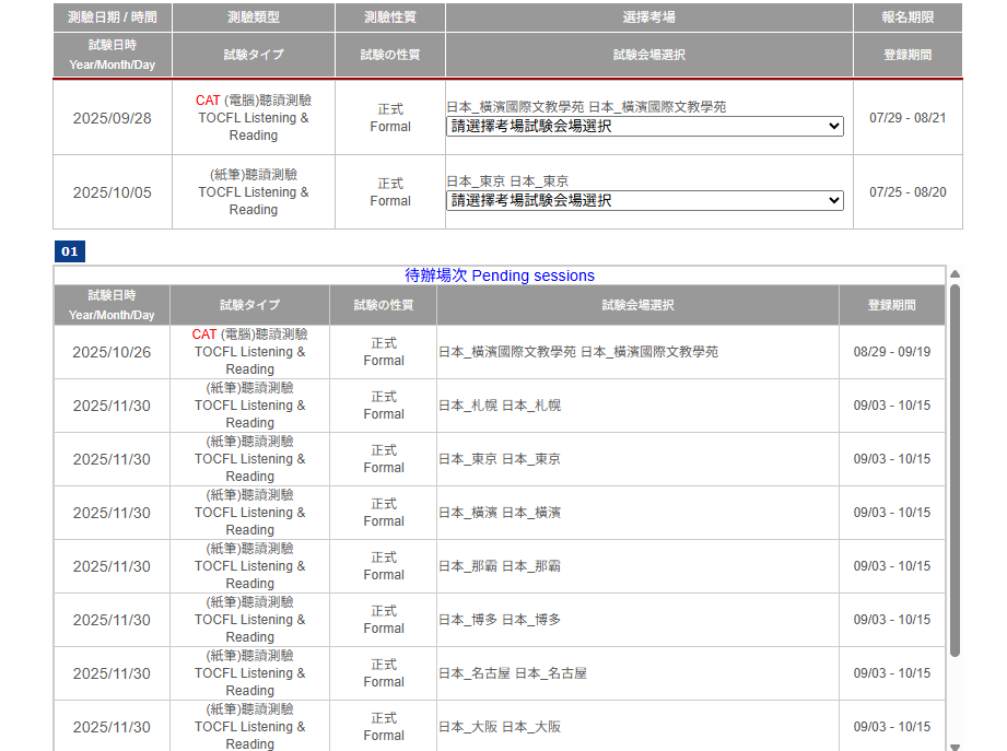CATと赤字で書かれているものは、CAT (電腦)聽讀測驗TOCFL Listening & Readingで電腦とある通り、コンピューター上で行うテストになります。英検で言うところのCBTのようなイメージです。