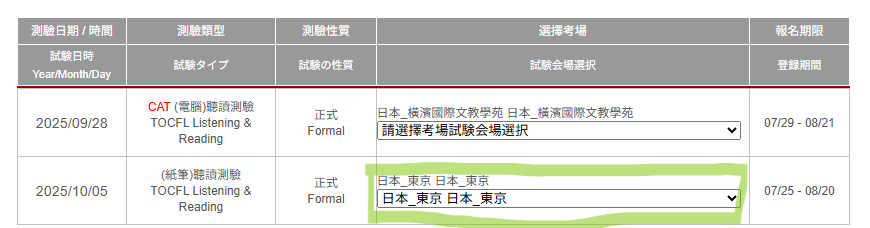 それぞれプルダウンメニューになっているので、Test Areaで日本での受験であればJapanを選択、Languageは日本語であれば中/日本語を選択します。