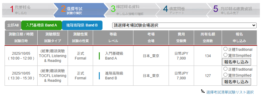 BandAを受検するか、BandBを受検するのかを選択し、正體Traditionalか简体Simplifiedかを選択して、報名(申し込み)をクリックます。