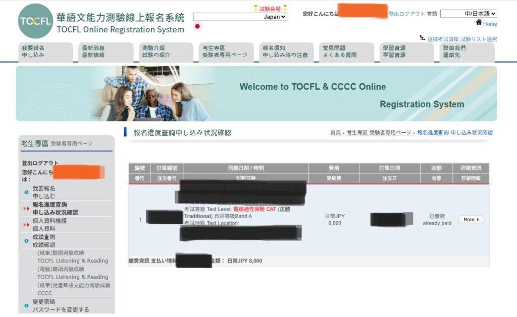 ちなみにこちらはCATを申し込みしたときの画面で、支払いが済んでいるので、状態の欄を見ると已繳款already paidとなっていますね。