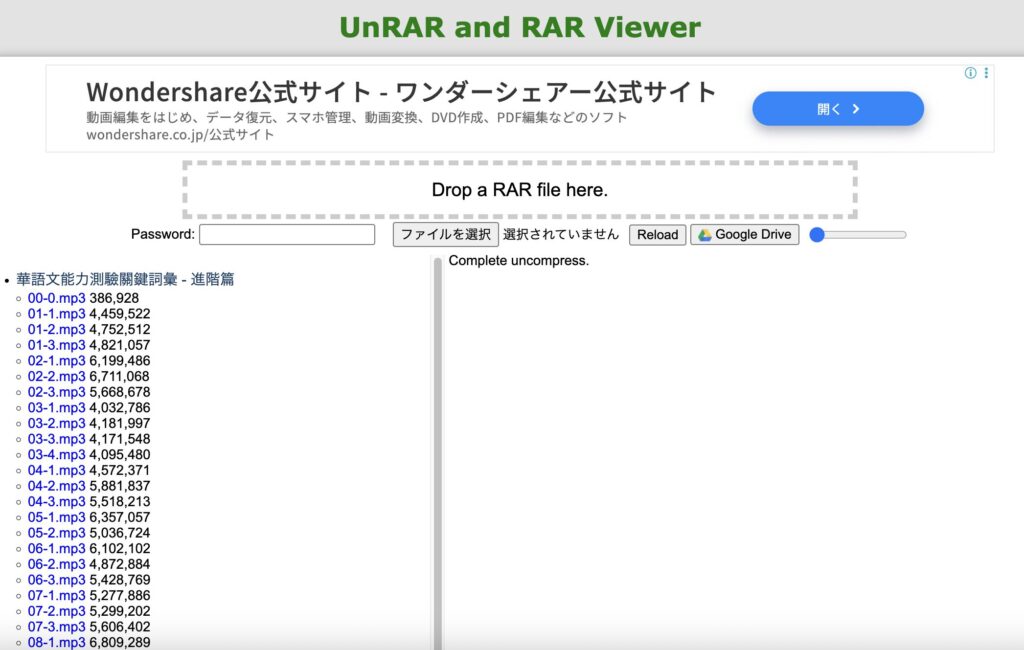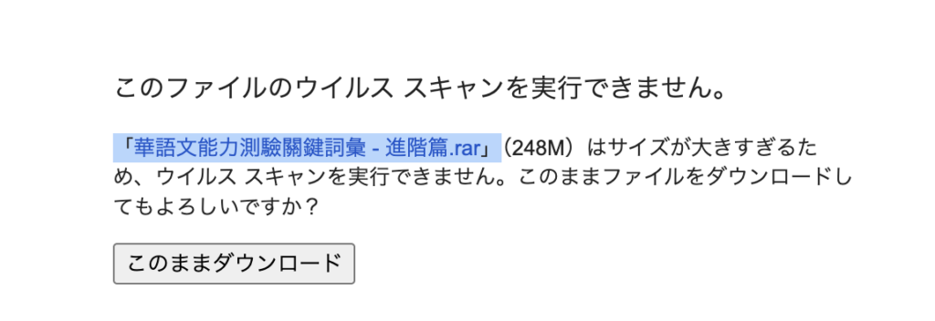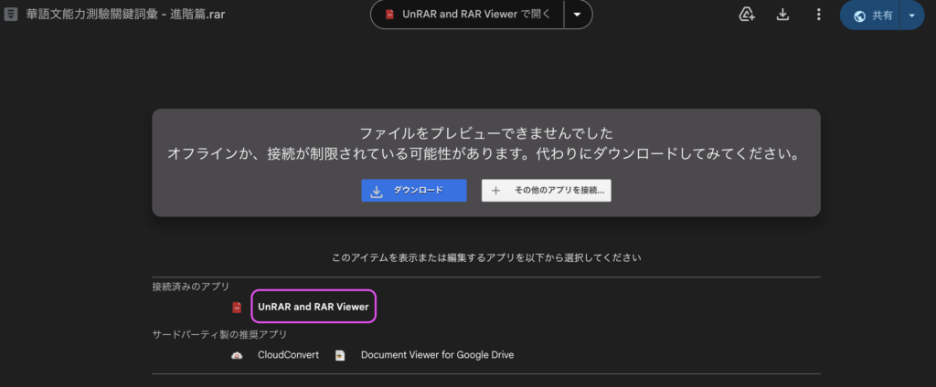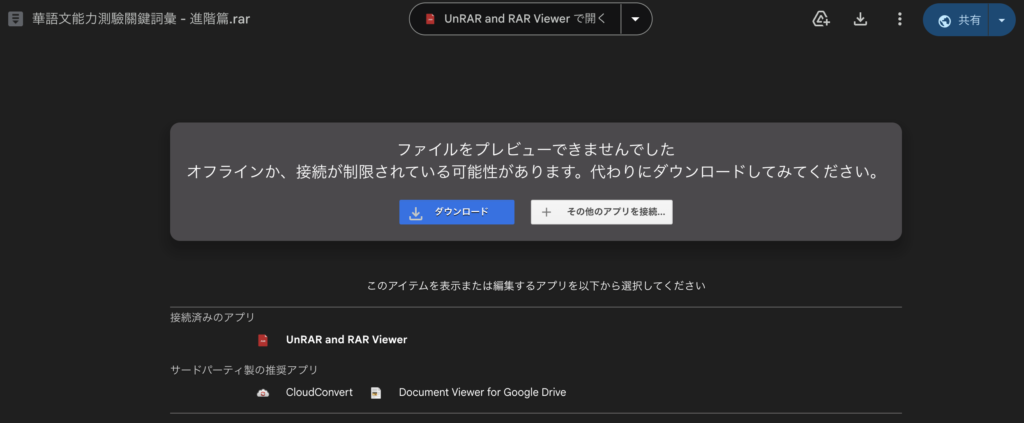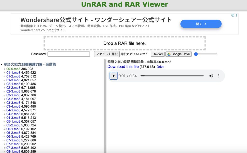 説明ではMP3形式とあったので、簡単にできると思っていましたがどうやら、「華語文能力測驗關鍵詞彙 – 進階篇.rar」となっており、拡張子が.rarになっていました。