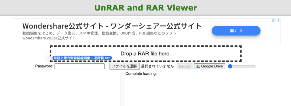 ダウンロードしたファイルをDrop a RAR file here.の点線で囲んである四角にドラッグ&ドロップすればMP3に変換されます。